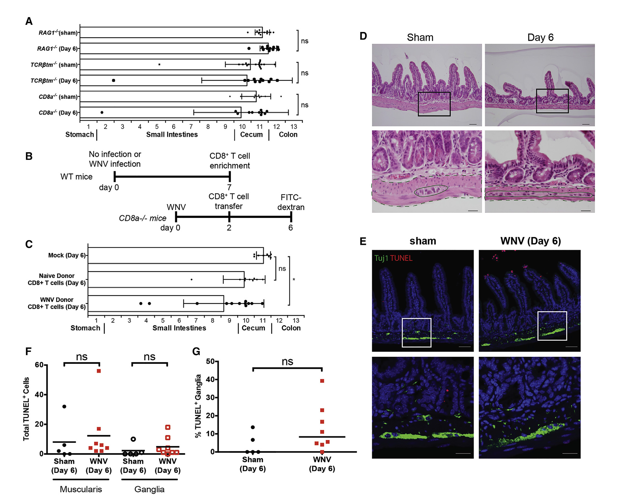 5.CD8 T生殖细胞能控制缓和WNV介导的肠腔胃排空缺陷过去阶段中