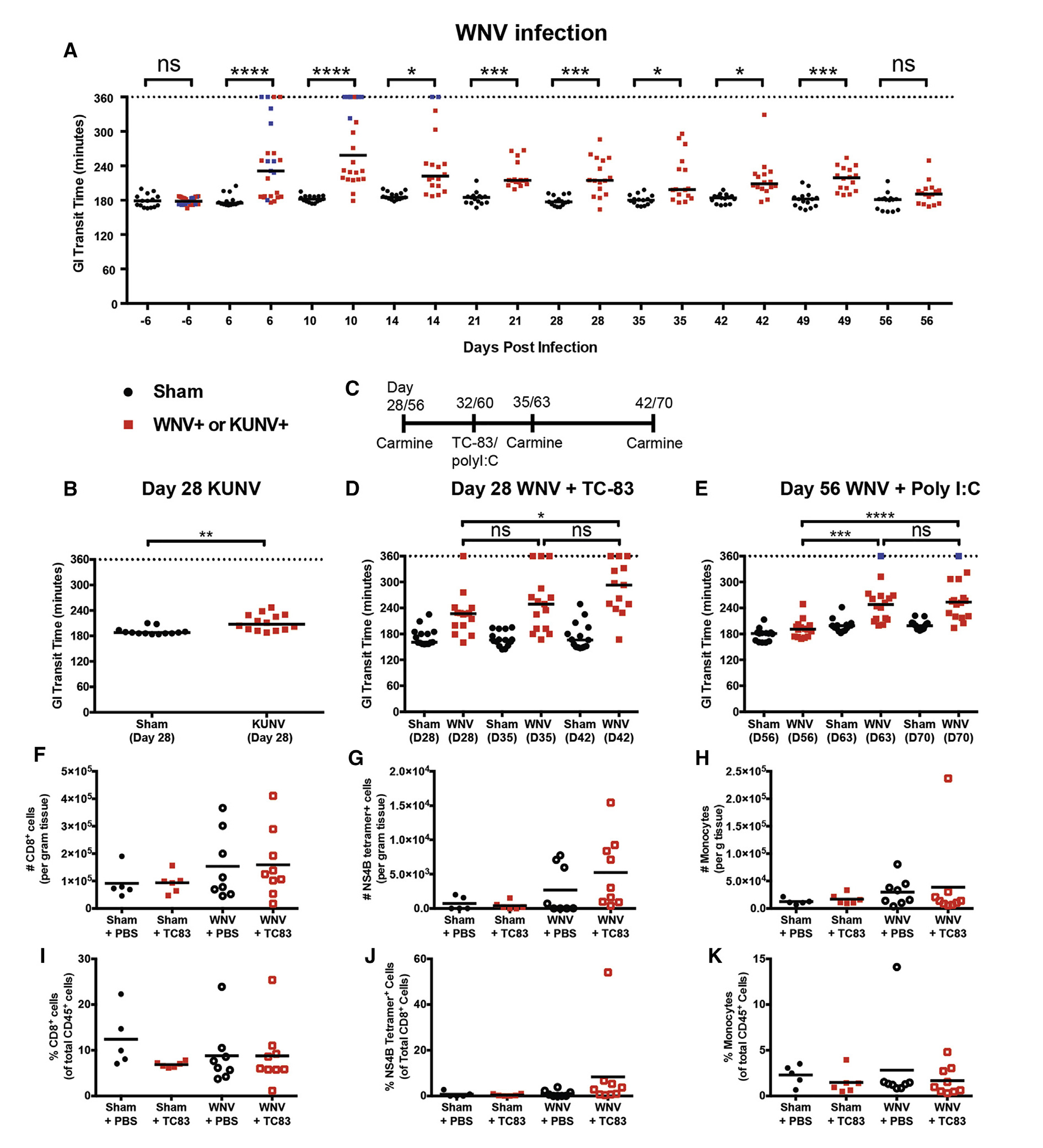 末尾,写作者对消化道道转运公司情况发生通过可以学习,察觉到WNV(或KUNV)诱骗的消化道道运作一些缺陷总是提升到感动后的第六周和七周(图7A,7B)。基于患上了消化道儒动障碍性用户的的显著特点--间歇式性出現拉肚子、腹泻、腰部疼痛的的事情[2],为此,顾客让小鼠在可以恢复期遇到是1种脑炎宏病毒(VEEV,TC-83 strain,WNV感动第六周注谢,图7D)还是是1种抗体畅快剂(polyI:C,WNV感动第七周注谢,图7E),察觉到据此的消化道事情又出現了。