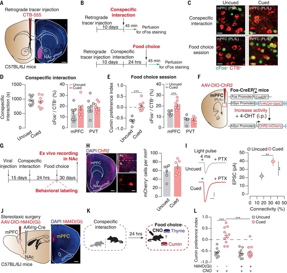 为探究映射到NAc的mPFC周围运动神经末梢元有无参于STFP,著者在小鼠NAc肌注逆向示踪颜料CTB-555,并使之与可食用过孜然味口味的小鼠社交网络网络类,24H后使其在二种口感的口味中进行决定(图1A-B)。大家找到小鼠趋向于孜然味口味且mPFC中被缴活码的CTB抗体阳型周围运动神经末梢元数据偏态曾加,而社交网络网络类动作与社交网络网络类动作缴活码的CTB抗体阳型周围运动神经末梢元数据无区别(图1C-E)。
