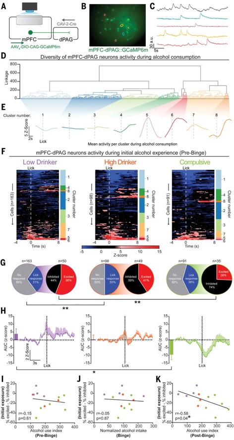 调查显示,多数人接触过酒精,但其中只有小部分人会发生强迫性酗酒现象。对于强迫性酗酒发生的诱因,我们知之甚少。本篇文章结合实验范式设计、钙成像、光遗传学等方法,发现mPFC-dPAG环路与酒精强迫性密切相关。在小鼠初次饮酒时,其mPFC-dPAG神经元的活性可表征小鼠对酒精的易感性。此外,抑制mPFC-dPAG环路诱发小鼠发生强迫性酗酒行为,而激活mPFC-dPAG神经元显著减少小鼠饮酒行为。这项研究阐释了调控强迫性酗酒发生的脑区及其神经环路机制,为酒精易感性的个体差异提供了一种可能的科学解释,也为临床治疗强迫性酗酒相关疾病提供理论基础。