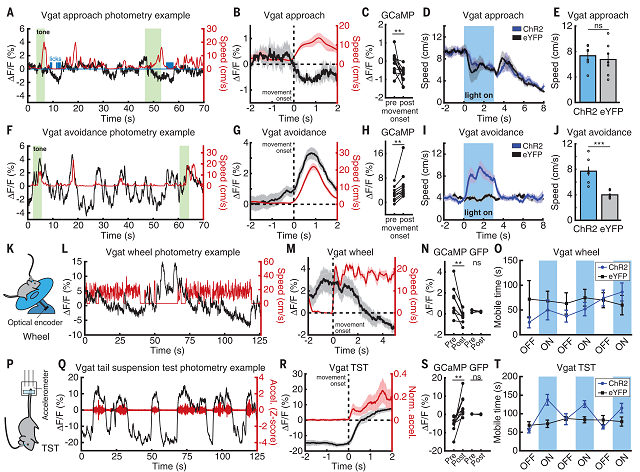 最后,为研究DRN GABA神经元激活水平与运动起始的因果关系,作者在Vgat-Cre小鼠的DRN中注射AAV-DIO-ChR2并植入光纤,发现光激活DRN GABA神经元不影响转轮范式与接近范式中小鼠运动速度和穿越壁垒的时间(图4D-E,O);但在躲避范式与悬尾范式中,光激活DRN GABA神经元增加小鼠运动速度与挣扎时间(图4I-J,T)。