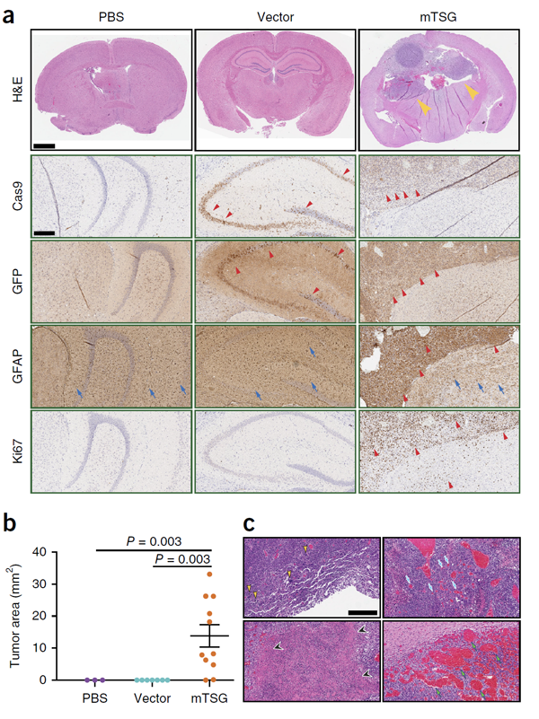 2. AAV-mTSG注射的小鼠脑肿瘤展现了胶质母细胞瘤的特点