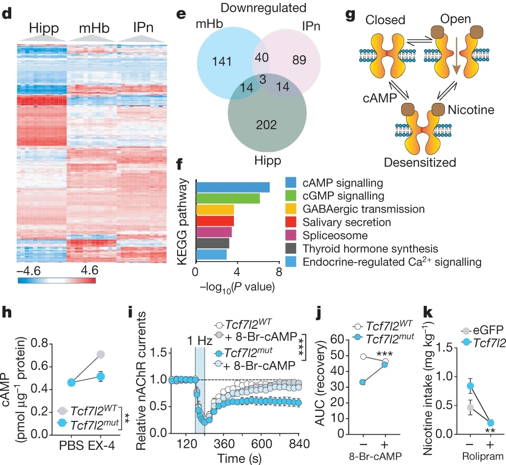 接下来,作者进一步探究mHb神经元中TCF7L2调控nAChR的分子机制。因为TCF7L2是一种转录因子[11],因此TCF7L2突变鼠mHb神经元中多种基因的表达水平会出现变化,这些基因可能介导TCF7L2对nAChR的调控作用。他们使用RNA测序结合KEGG分析方法探究mHb、 IPn和海马中表达水平显著下调的基因,发现TCF7L2突变鼠mHb神经元cAMP信号显著下调(图4d-f)。