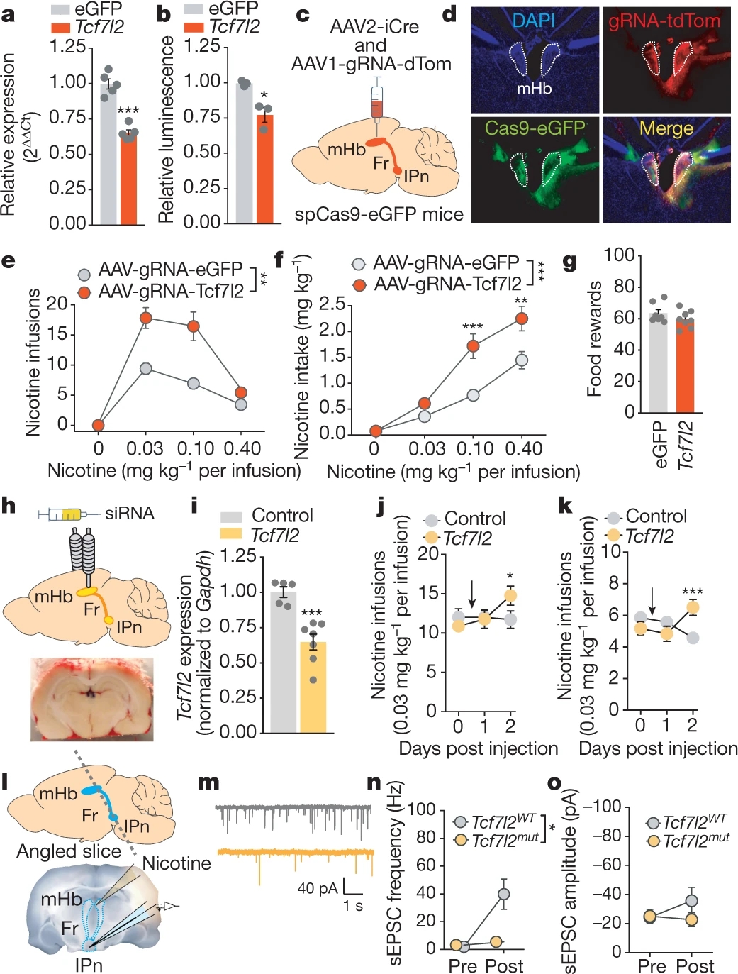 前文的方法降低了所有细胞中TCF7L2的表达量,为进一步探究mHb神经元中TCF7L2的功能,作者使用CRISPR-Cas9系统降低TCF7L2表达,他们在spCas9-eGFP小鼠的mHb中注射AAV-Cre和AAV-sgRNA-Tcf7l2,发现这些小鼠的烟碱摄取量显著提高,而食物摄取量不变(图2a-g)。他们还使用了siRNA方法降低mHb神经元中TCF7L2表达,得到相似结果(图2h-k)。以上结果表明,mHb神经元中TCF7L2调控机体对尼古丁的摄取。