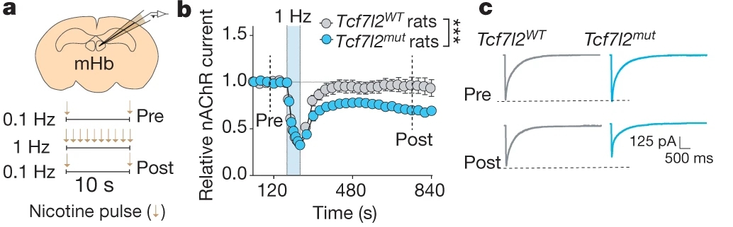 过去的的探讨取决于,mHb中nAChR抗体阳性周围脑精神系统系统元介导烟碱的看不惯性不良反应[5]。为研究mHb周围脑精神系统系统元中nAChR效果是不是也受TCF7L2调整,小说作者在使用膜片钳电生理变化方式计录大鼠mHb周围脑精神系统系统元,发展在低頻增加烟焦油前提品质下,计录到的nAChR功率的浮度显著性减弱。而在之后低頻增加烟焦油的前提品质下,合适大鼠mHb周围脑精神系统系统元中计录到的nAChR功率飞速已经复原至本底品质,而TCF7L2转变鼠mHb周围脑精神系统系统元中计录到的nAChR功率没有办法已经已经复原(图3a-c),取决于TCF7L2调整mHb周围脑精神系统系统元nAChR失敏后的已经复原期间。