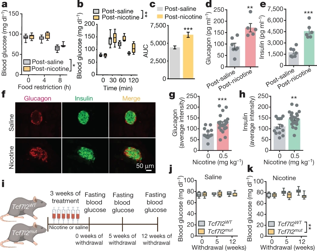 最好,作家探究式血糖质量对烟碱摄食的反功能。作家让大鼠长时(连续式3周)的摄入量过大量过大烟碱以仿真长时吸烟的吸烟,出现长时的摄入量过大量过大烟碱的大鼠的空肚血糖质量为更为明显偏高(图6a-c),胰岛素和胰高血糖素的解放量亦为更为明显上升(图6d-e),此相应在烟碱戒断后已经维持一月之久(图6f-h)。而关于TCF7L2基因变异鼠,长时的摄入量过大量过大烟碱越多越大幅度降低胰岛素和胰高血糖素的解放质量(图6i-k),已经由TCF7L2基因变异以至于机身血糖调节的内稳定失去平衡形成。