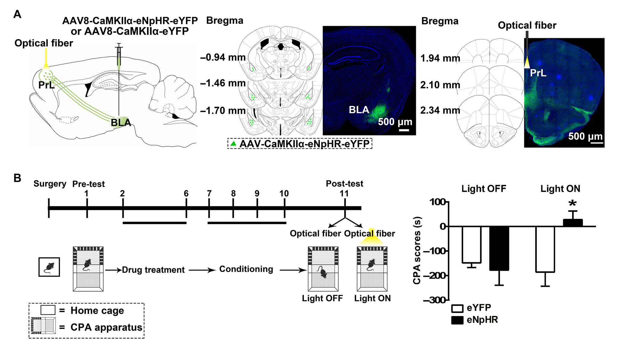 下面来,小说作者在小鼠的BLA中打AAV8-CaMKⅡα-eNpHR-eYFP,在PrL埋植金属(图2A),出现在CPA试验期光仰制性BLA-PrL神经系统环路可显著的仰制性戒断场所对成瘾的记忆的成功激活(图2B)。