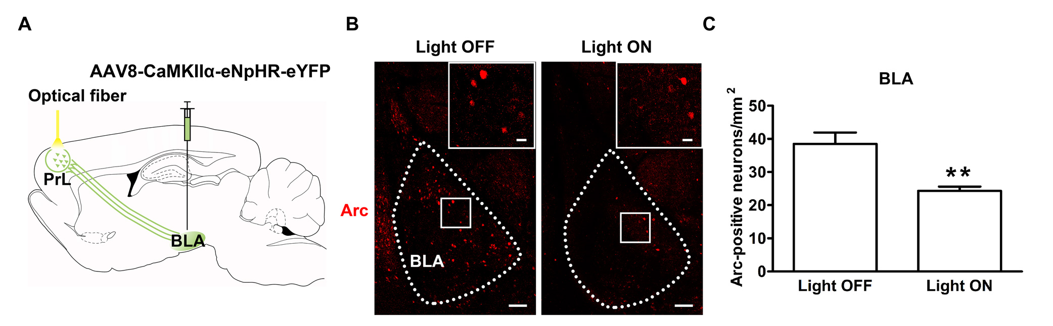 最后一步,自己在小鼠的PrL接种AAV8-CaMKⅡα-eNpHR-eYFP,在BLA埋植光仟(图7A),然而发展,光抑止PrL-BLA周围周围神经环路特别抑止小鼠对戒断的环境的痛恨行为,而且,也抑止了戒断的环境对BLA中Arc的更改密码(图7B)。这样信息提升了, 抑止PrL-BLA周围周围神经环路可不可以抑止戒断的环境对吗啡戒断小鼠记意无线信号的分离出。