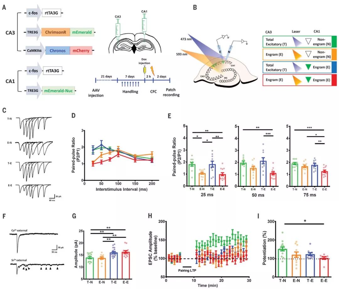 最后,作者在T-N、E-N、T-E、E-E之间诱导LTP,发现只有E-E之间的投射强度无变化,提示之前记忆的形成已经诱发E-E之间的LTP,因此投射强度无法进一步提高(图4H-I)。