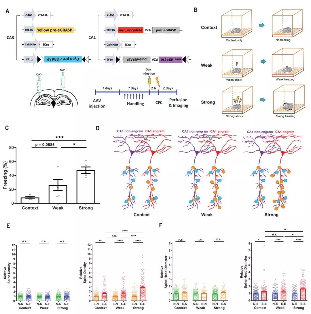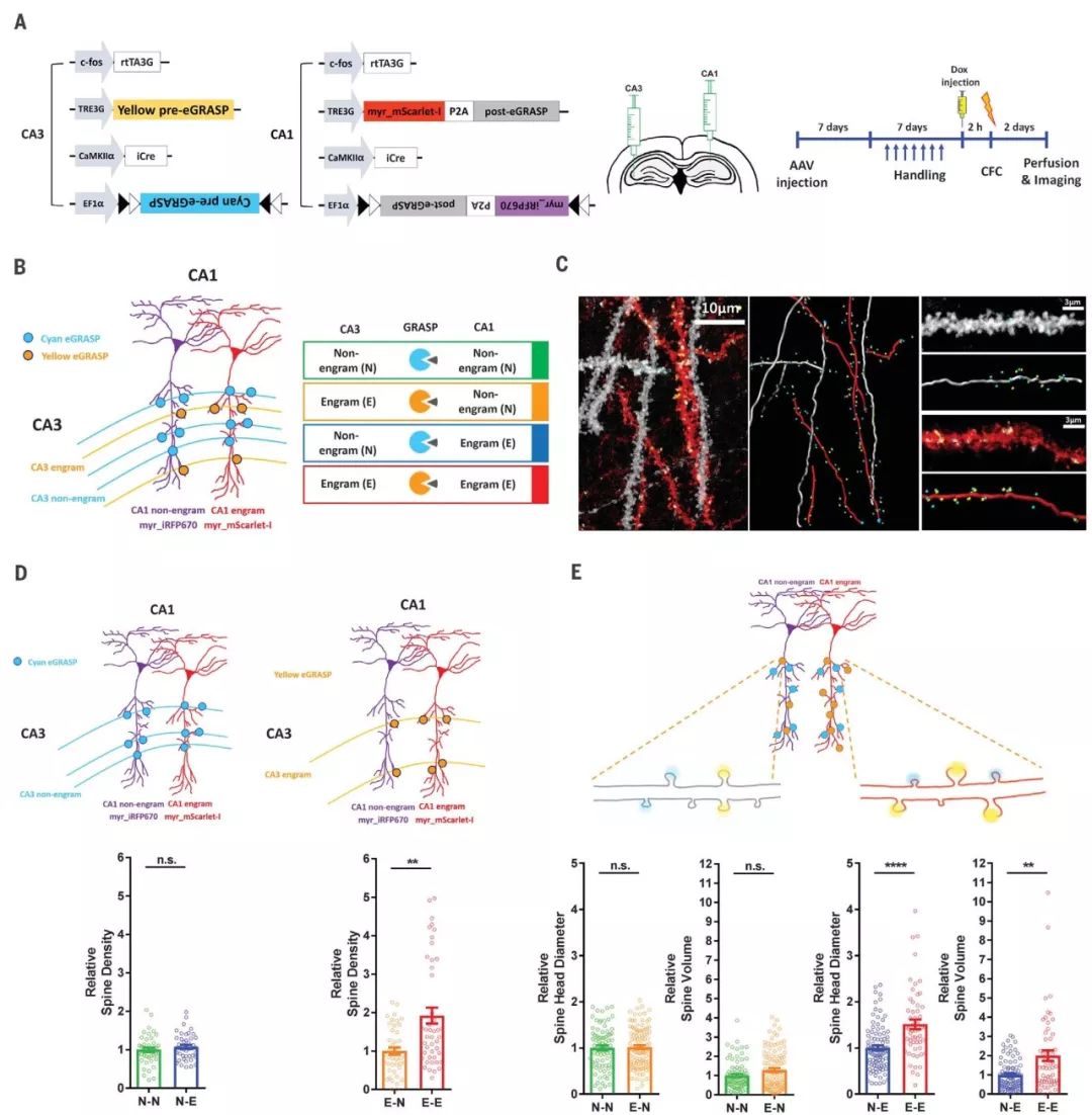 组合Fos-TRE模式[3],写作者选择作出dual-eGRASP技艺探讨记忆里存放的突触地理位置。自己在对侧CA3填充AAV-c-Fos-rtTA3G和AAV-TRE3G-黄颜色pre-eGRASP,因只要 被启用的运动精神元能开机c-Fospcb板,因为只要 CA3痕印生殖細胞核核(E)可描述黄颜色pre-eGRASP;自己在同侧CA3中填充极一少部分AAV-Cre和多AAV-DIO-黑色pre-eGRASP,以重复数标记图片符号图片CA3运动精神元,轴突末段描述黑色不描述黄颜色荧光的即非痕印生殖細胞核核(N)。又用Fos-TRE模式与红白色荧光蛋清质标记图片符号图片同侧CA1痕印生殖細胞核核(E),用极一少部分AAV-Cre和多AAV-DIO-紫荧光蛋清质重复数标记图片符号图片CA1运动精神元,CA1紫非红白色运动精神元即非痕印生殖細胞核核(N)(图2A-B)。