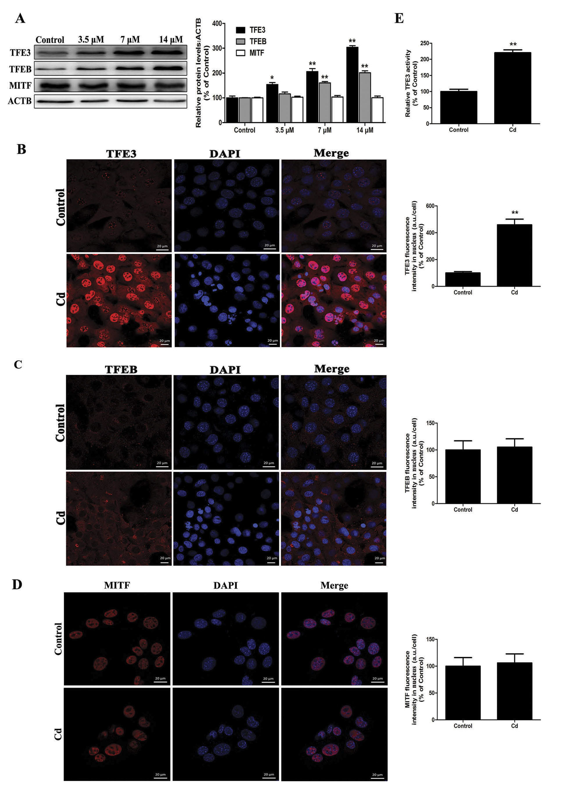 TFE3(转录因素E3)是亮氨酸金属拉链转录因素家族性的成员介绍,核心调理自噬和溶酶体引发的关联染色体的表示方式[3]。免疫细胞荧光和荧光素酶上报染色体验测等实验设计都断定Cd治理增进TFE3认定位,TFE3成功激活自噬关联染色体的表示方式(图2)。