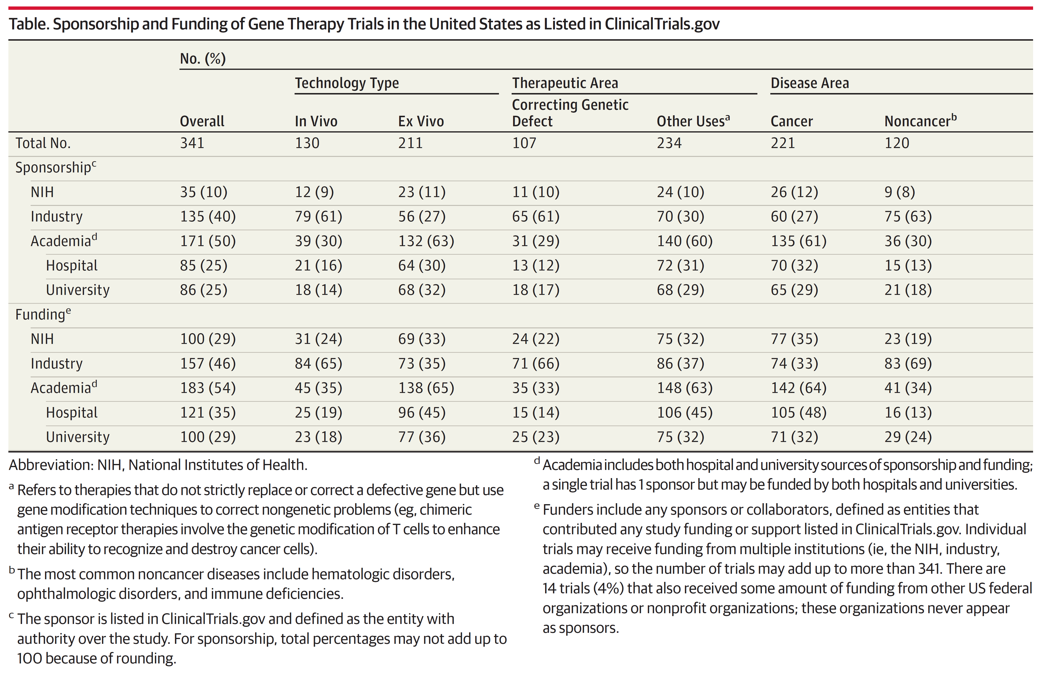 在统计到的826个临床试验中, 341个符合数据统计分析入选标准。在纳入的试验中,130例(38%)是体内基因治疗(其中107例的目的为修正基因缺陷),221例(65%)是肿瘤治疗疗法(见表1)。