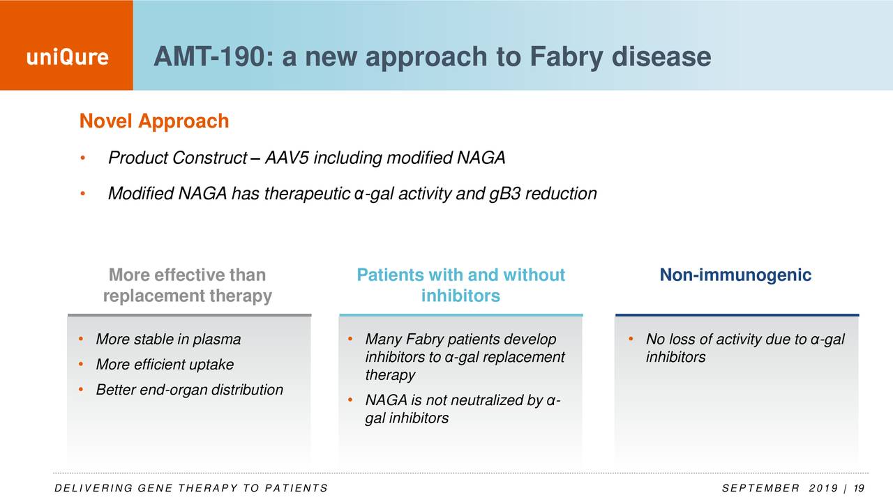 法布里病是α-半乳糖苷酶A(α-Gal A)的基因突变导致的X染色体遗传性多系统溶酶体贮积病,男性新生儿发病率为1/110000~1/40000。法布里氏病目前的标准治疗方案是每两周注射一次α-半乳糖苷酶A的替代疗法,用于阻止疾病进展。然而该疗法对已经损害的器官不能恢复,且针对各脏器受累情况应给予相应处理,特别是肾脏、心脏和脑卒中的治疗,从而影响该药物在大量病患中的应用。AMT-190疗法可在体内表达独家授权的改进型NAGA (ModNAGA),该蛋白在结构上与α-Gal 高度相似,因而与目前的治疗方法相比,ModNAGA可能有一些优势,包括血浆中更高的稳定性、避开GLA抗体的影响、以及在靶器官中更好的吸收等。