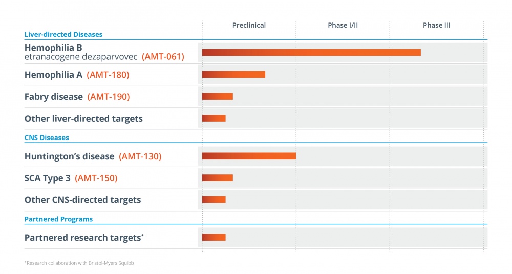 A型血友病是由于凝血因子VIII缺乏而导致的一种X染色体相关疾病,凝血因子VIII是凝血级联激活过程中凝血因子IX的辅助因子。A型血友病是临床上最常见的血友病,约占血友病人数的80%-85%,约三分之一的A型血友病病例是自发基因突变导致的,约三分之一的血友病患者在患病过程中会产生凝血因子VIII的抑制剂。AMT-180基因治疗药物借助重组AAV5载体携带专有的改造型凝血因子IX基因,治疗A型血友病。