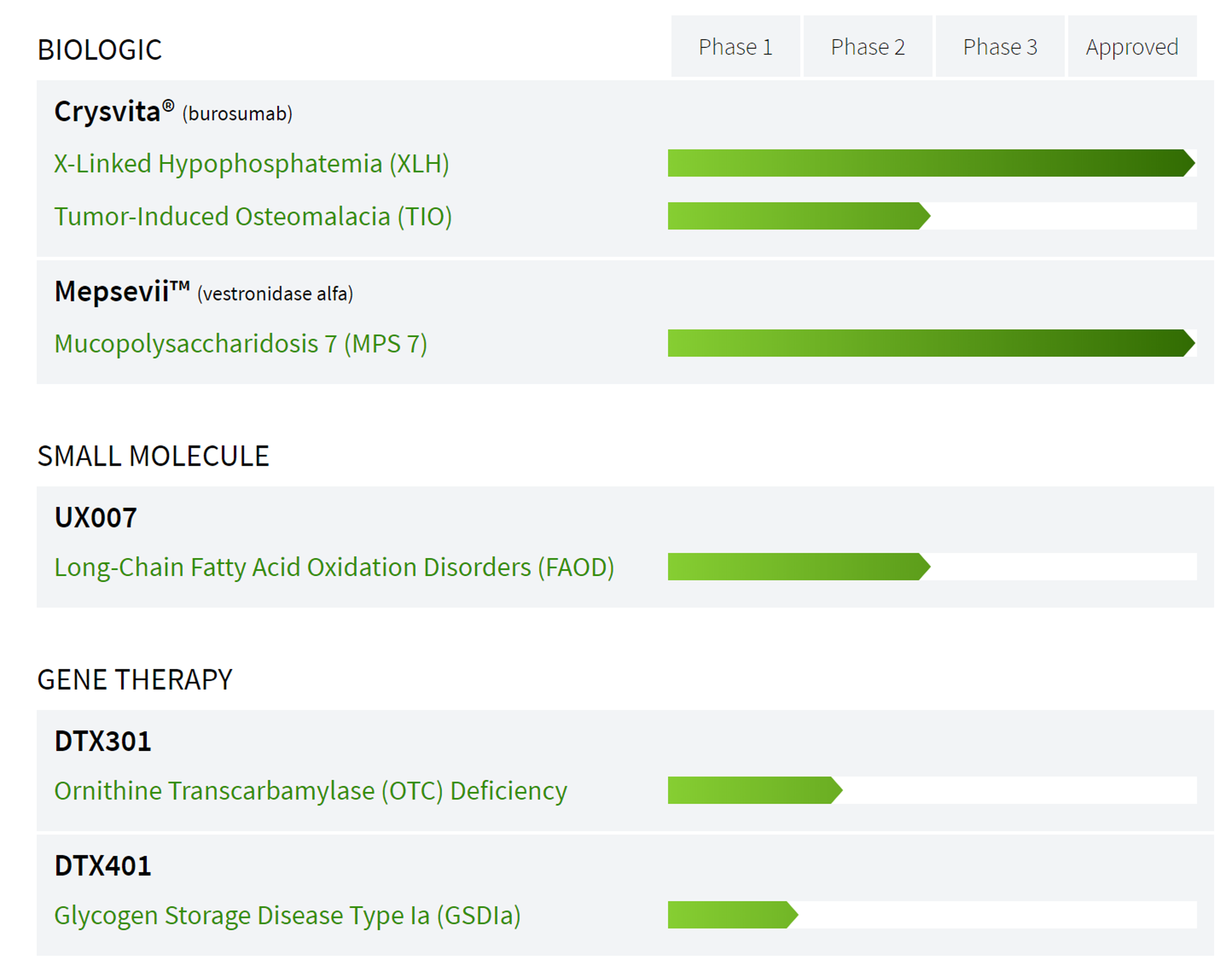 DTX401是Ultragenyx开发的试验性AAV8基因疗法,旨在提供稳定表达和有活性的G6Pase-α。在临床前试验中,DTX401作为一个单一静脉注射的基因疗法,已被证明可以修复G6Pase-α的活动,减少肝糖原的水平。DTX401被FDA和EMA授予孤儿药认定,在美国还被授予再生医学先进治疗疗法(RMAT)指定和快速通道指定。