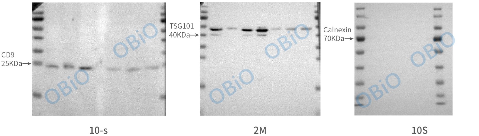 按照实验室常规操作进行外泌体样本的WB实验。本次测试选择了三个蛋白指标进行外泌体蛋白鉴定,分别为二阳一阴,即CD9、TSG101和Calnexin。WB结果如下: