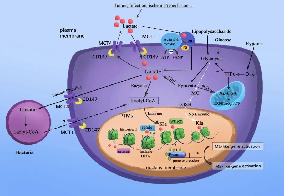 M1 型巨噬细胞糖酵解活跃,胞内乳酸化修饰组蛋白 H3K27,抑制抗炎基因(如 IL-10)表达;而 M2 型巨噬细胞以氧化磷酸化为主,乳酸化水平降低。