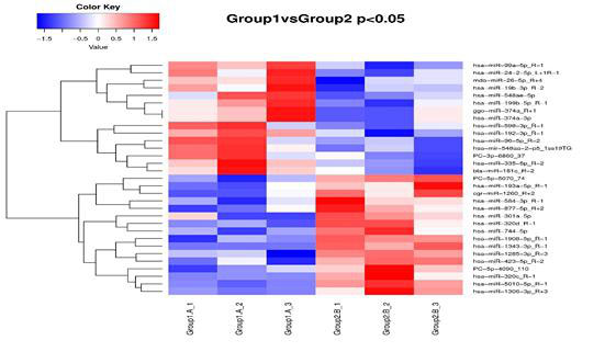 差异miRNA聚类分析用于判断miRNA在不同实验条件下调控的聚类模式。根据样品miRNA表达谱的相近程度,将miRNA进行聚类分析,直观地展示miRNA在不同样品(或是不同处理)中的表达情况,由此获取生物学相关信息。不同的颜色表示不同的miRNA表达水平,颜色由蓝色经由白色至红色表示表达量从低到高。红色表示高表达基因,深蓝色表示低表达基因。