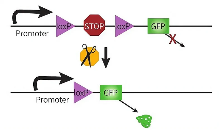 Cre-LoxP系统可以实现对基因的操控,根据Cre重组系统诱导基因重组的方式,我们可以通过如下两种策略实现Cre依赖的基因表达: