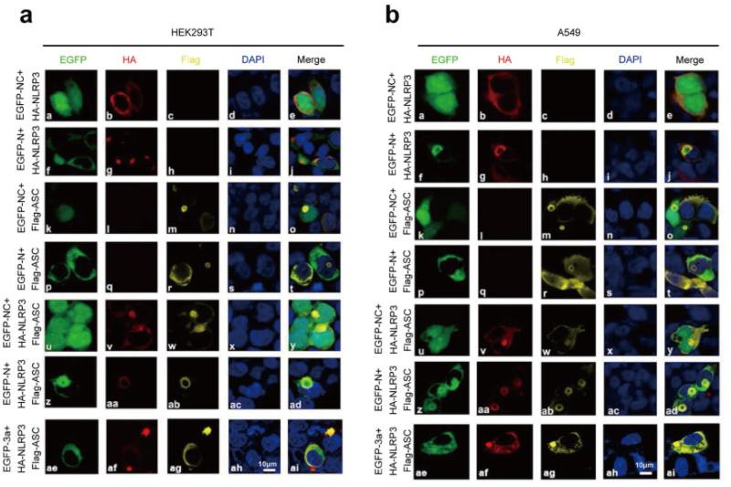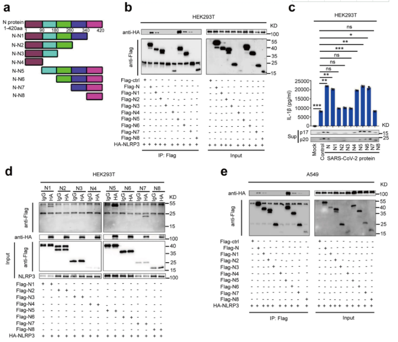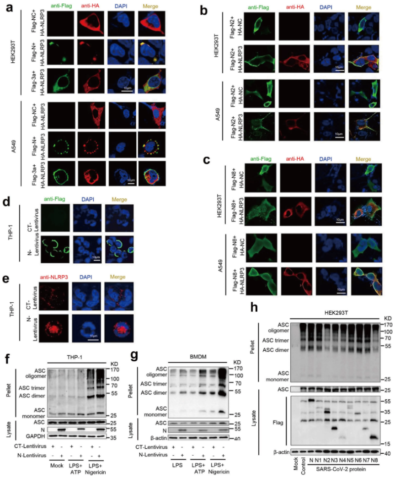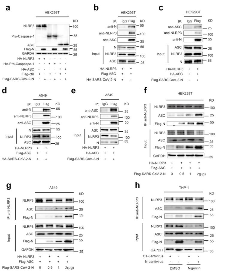 接下来研究人员对N蛋白在调节NLRP3炎症小体成分中的作用进行研究。结果显示,N蛋白对NLRP3、Caspase-1和ASC的蛋白水平没有影响,然而NLRP3存在时N和ASC可以相互免疫沉淀(Fig.5a-5e)。因此,该结果提示N蛋白、NLRP3和ASC三个蛋白可能形成一个复杂的N-NLRP3-ASC复合物。N蛋白增强NLRP3与ASC的相互作用在HEK293T和A549细胞并呈剂量依赖(Fig.5f-5g)。同样,在PMA-differentiated THP-1-N细胞中,Nigericin促进 N蛋白在NLRP3存在的情况下与内源性ASC相互作用(Fig.5h)。因此,CoV-2 N 促进NLRP3与ASC的相互作用。