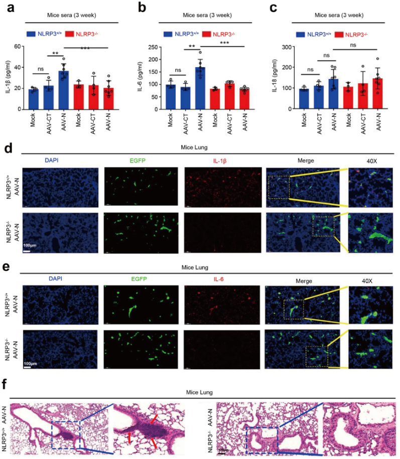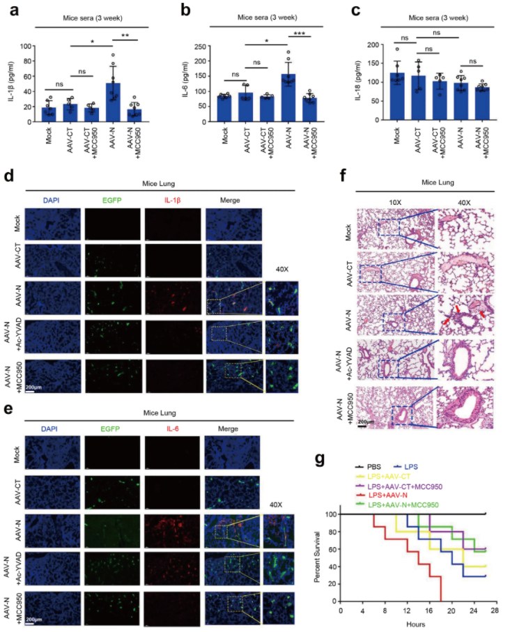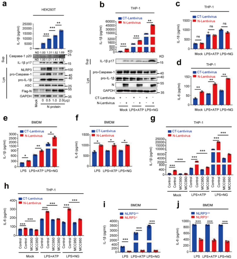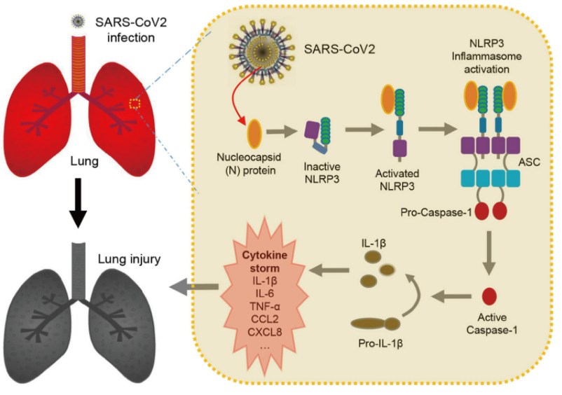 暨南大学吴建国教授/潘攀研究团队,在Nature子刊《Nature Communication》发表题为“CoV-2 N protein promotes NLRP3 inflammasome activation to induce hyperinflammation”(DOI: 10.1038/s41467-021-25015-6 ),该研究展示了CoV-2 N蛋白通过促进NLRP3炎症小体激活诱导高炎症反应;N蛋白促进促炎因子的成熟,并诱发细胞和小鼠的促炎反应;N蛋白直接与NLRP3蛋白相互作用,促进NLRP3与ASC结合,促进NLRP3炎症小体组装;N蛋白加重脓毒症和急性炎症小鼠模型中肺损伤,加速死亡,促进小鼠IL-1β和IL-6激活。