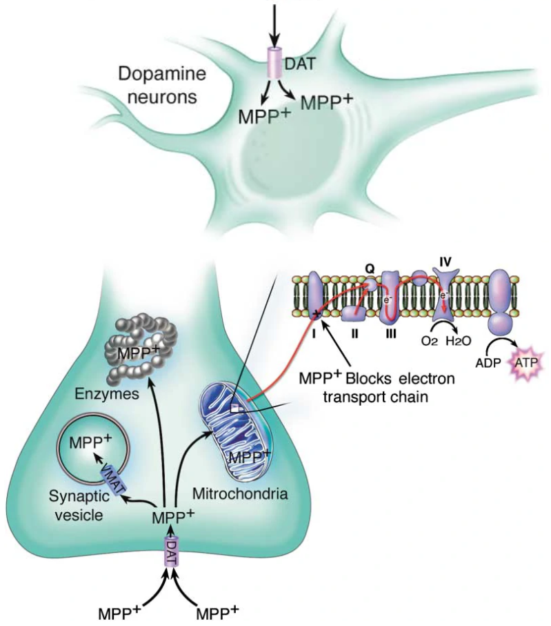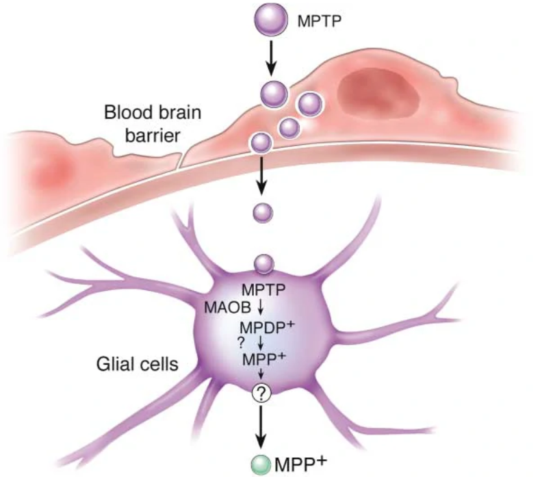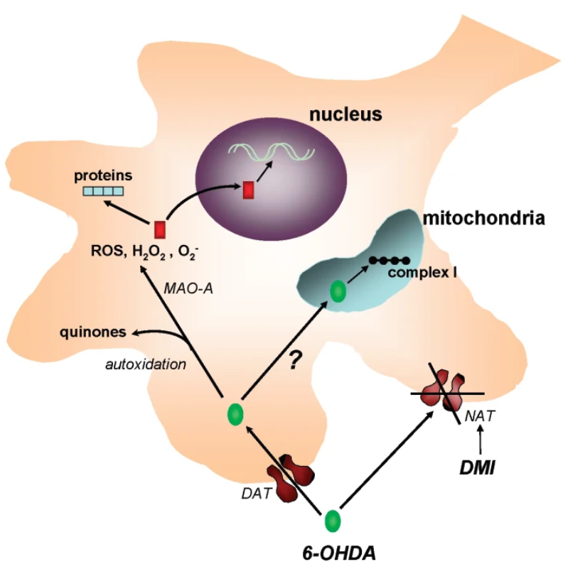 与MPTP不同的是,6-OHDA并不能穿透血脑屏障。因此为了达到中枢神经系统毁伤的效果,在使用6-OHDA进行帕金森造模时需要使用脑立体定位注射技术将6-OHDA注入到黑质-纹状体(striatonigral)这一多巴胺能投射通路中。具体的注射位点可以是黑质致密部(substantia nigra pars compacta, SNpc)、纹状体(striatum)或者位于二者之间的前脑内侧束(MFB)。