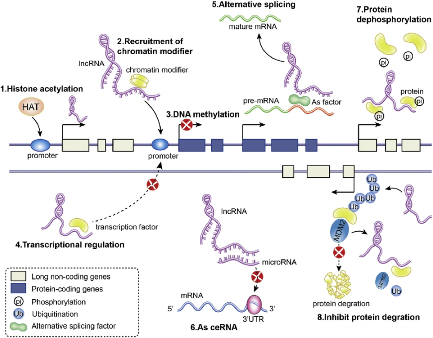 由于lncRNA的复杂性和多样性,不能简单地根据其结构或序列来描述其功能,但lncRNA的一个重要作用是调节邻近蛋白编码基因的表达。LncRNA在不同水平上调节基因表达: