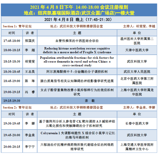 为了促进中医药与脑科学研究的发展,由中国生理学会中医药与脑稳态调控专业委员会主办的“2021年第三届中医药脑科学大会与认知障碍新进展高峰论坛”将于2021年4月8日至10日在武汉科技大学青山校区钢铁楼碧园会堂举行。诚挚地邀请各位同行学者、学生及相关领域人士参加此次盛宴。