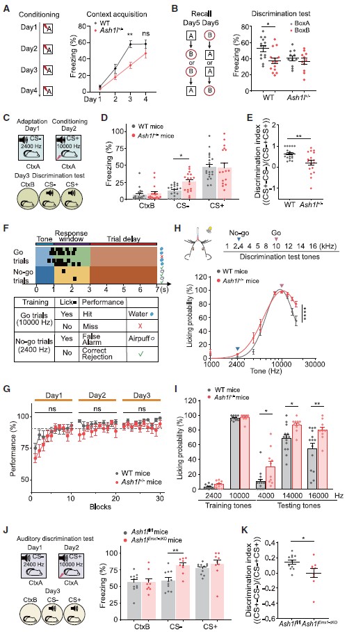 接下来,研究人员对Ash1l缺失小鼠的学习行为进行评估,借助条件性恐惧反射范式发现,Ash1l+/-小鼠和WT小鼠均学会了情境性恐惧条件反射,并表现出类似的恐惧记忆重提水平,然而Ash1l+/-小鼠在恐惧学习的第三天表现出木僵行为(freezing, 小老鼠的一类预防反應)下降;此外,在Ash1l+/-小鼠中未观察到两种不同环境下的木僵行为差异(WT小鼠在context A中表达出较高的木僵形为,在context B(新区域)中表达出较低的木僵形为),提示了Ash1l+/-小鼠辨别能力受损(图2A,B)。