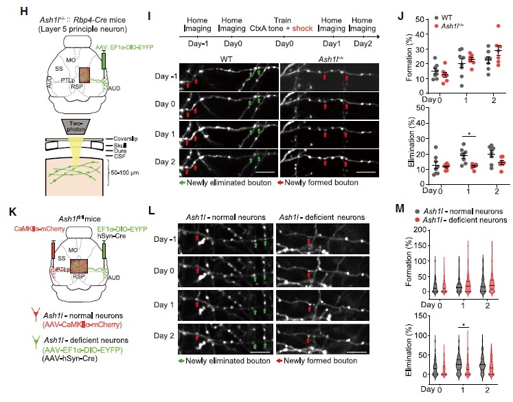 为探究这种“突触修剪”过程的缺失是否由Ash1l缺失神经元的细胞自主效应导致的,研究人员将AAV-hSyn-Cre和AAV-EF1a-DIO-EYFP注射于Ash1lfl/fl小鼠左测AUD区(图3K),对小鼠进行音调依赖的恐惧条件行为学范式训练,在学习之后借助体内成像技术追踪突触的变化,发现Ash1l缺失的神经元中学习依赖的突触的增加数量没有发生改变,而学习诱发的突触的减少数量显著低于正常小鼠(图3K-M)。这些数据提示了Ash1l以细胞自主效应的方式介导皮层神经元的活动依赖的突触修剪过程。