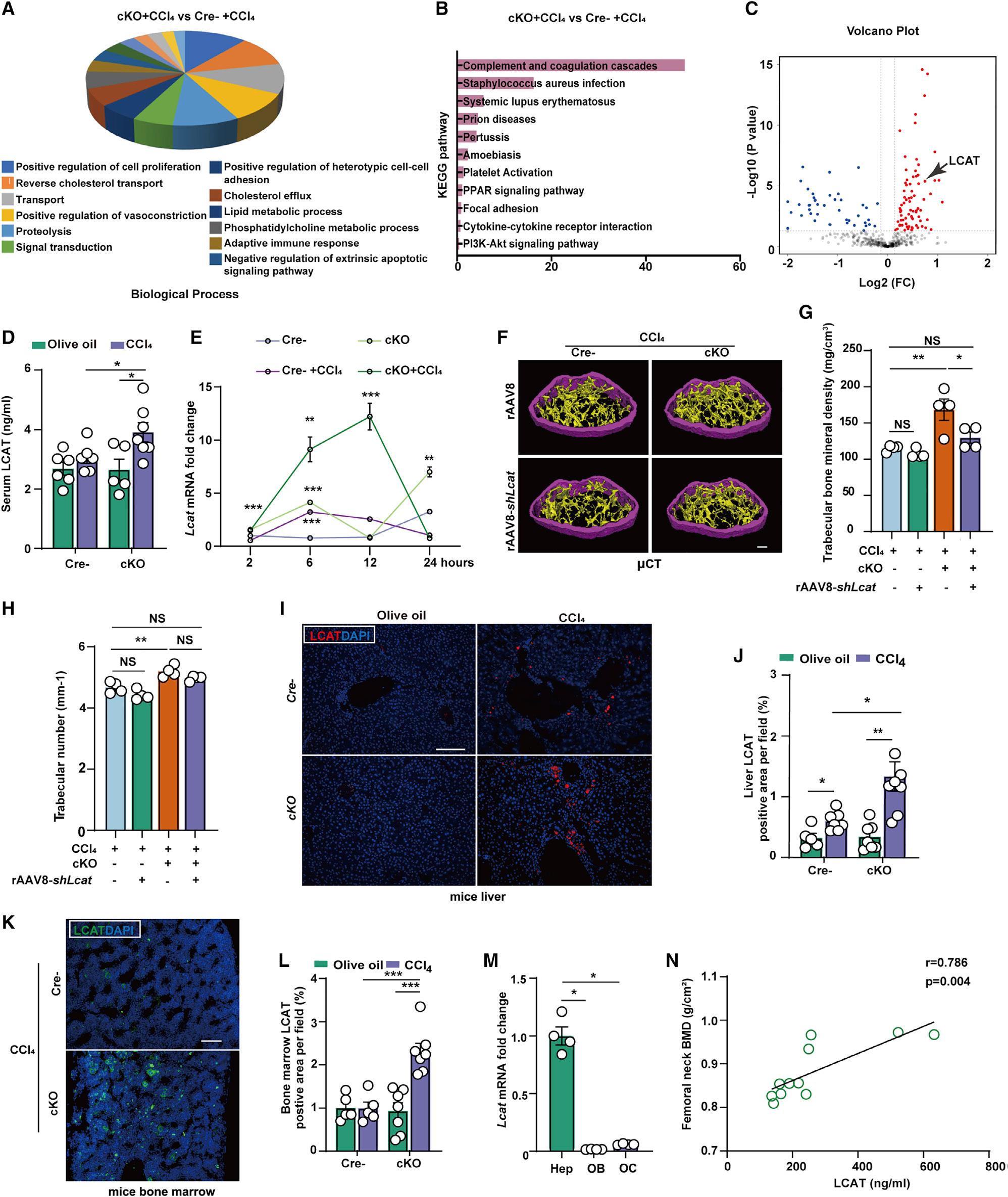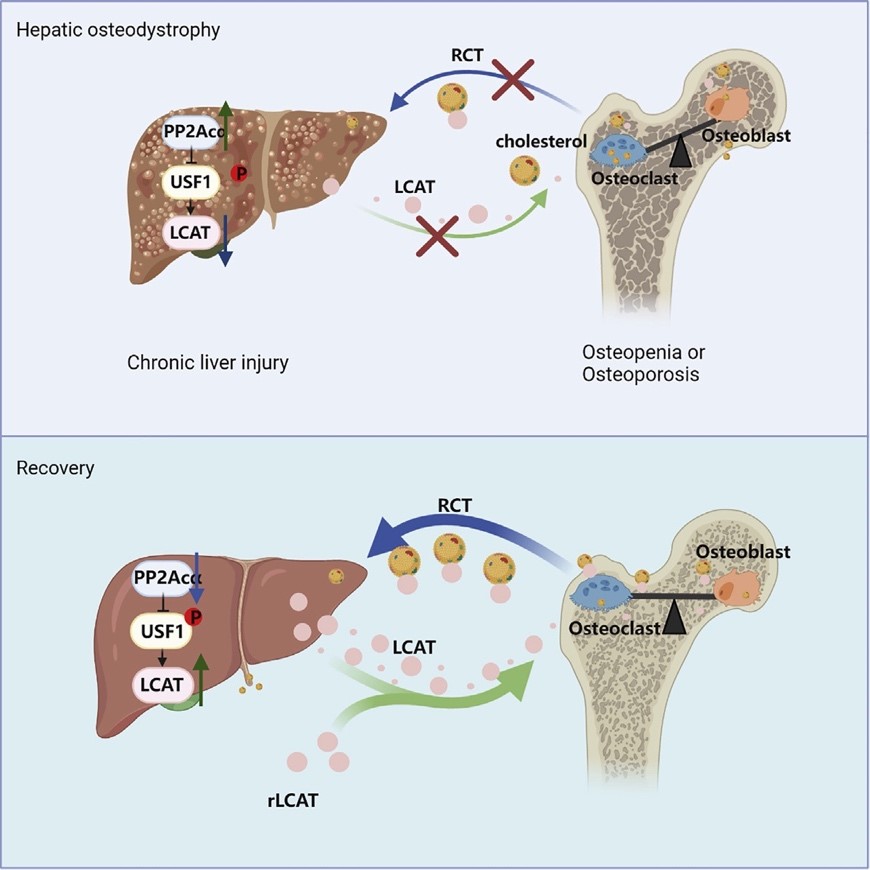 肝骨营养不良(HOD)是一种代谢性骨病,常与慢性肝病相关,以骨流失和骨质疏松为特征。全世界约有8.44亿人口,近75%有HOD,患有骨质减少或骨质疏松症。2022年3月1日,南京大学医学院蒋青教授研究团队与南京医科大学附属逸夫医院薛斌教授团队、南京医科大学李朝军教授团队、中科院深圳先进院陈棣教授团队合作(陆克博士与石天舒博士为本文共同第一作者)在Cell Metabolism上发表了文章Defects in a liver-bone axis contribute to hepatic osteodystrophy disease progression,发现在HOD的发病机制中发现了一个新的肝-骨轴,涉及肝脏PP2Acα的上调,导致肝因子卵磷脂-胆固醇酰基转移酶(LCAT)的表达减少,以及胆固醇从骨到肝脏的逆向转运缺陷。(DOI://doi.org/10.1016/j.cmet.2022.02.006)