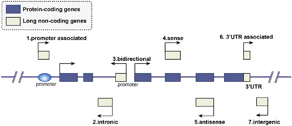 LncRNA表明其相对应于地位在调节管控靶打码人类表观遗传组中起着必要影响,表明其在人类表观遗传组组上与打码人类表观遗传组相对应于地位的多种,需要将lncRNA可分成下述哪种(见图1):1.无法时时子区(存有无法时时子空间的转录本);2.里面子间(其通常带来于打码人类表观遗传组的里面子区);3.双相(与核营养素打码人类表观遗传组公享相当的无法时时子,但转录方位反向的词语);4.真理链(转录方位与核营养素打码人类表观遗传组方位相当,存有于相同的打码人类表观遗传组真理链,拥有重合的外显子);5.反义链(转录方位与核营养素打码人类表观遗传组方位反向的词语,存有于反义链,最好一斜个外显子重合);6.3’UTR区(存有3’UTR空间的转录本);7.人类表观遗传组间(存有于多个核营养素打码人类表观遗传组彼此的DNA字段)。与mRNA一样,lncRNA也需要存有于血组织结构或血组织质中,但其通常最靠近血组织结构。