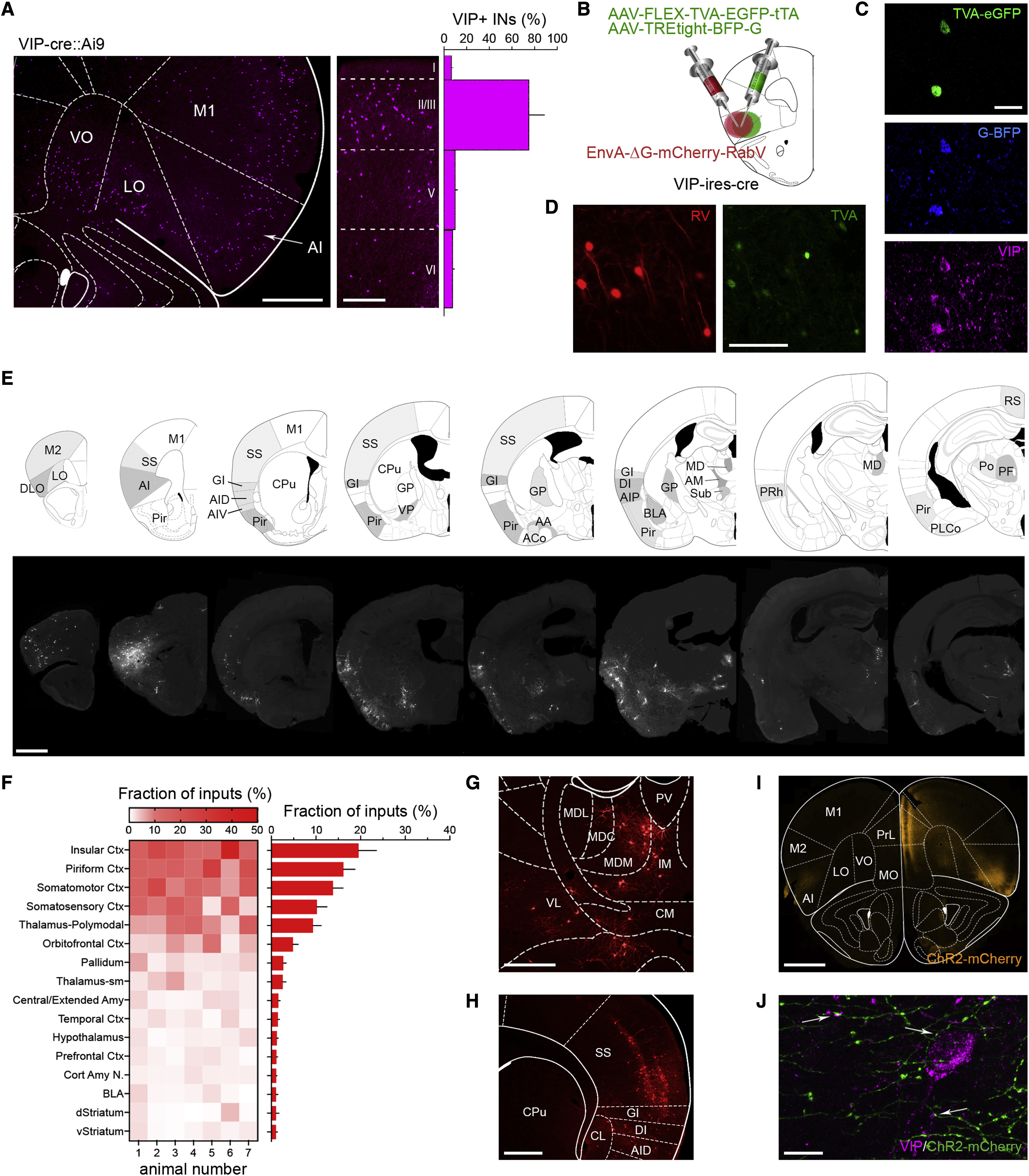 在之前的解读文章中,我们曾经提出过一个环路研究的基本思路,也就是“先示踪,再记录,最后操纵” (具体内容可以回顾往期文章)。在本研究中也不例外,论文的第一部分就是喜闻乐见的神经示踪研究。具体而言,作者先是利用组织学手段确定了皮层中VIP+INs主要位于第2/3层(图 2A,注意皮层一共有6层,但岛叶皮层的第四层很薄所以在文中被忽略了)。接下来使用伪狂犬病毒的逆向示踪技术,作者确定了与岛叶皮层VIP+INs存在单突触连接的脑区分布(图 2B-2E)。结果显示VIP+INs除了与同脑区的其他神经元形成微环路外,还接受了多种感觉相关皮层的输入,如体感皮层(触觉之类的躯体感觉)和梨状皮层(嗅觉)等(图2 F)。在之前的解读文章中我们也指出,一个扎实的示踪实验需要顺向和逆向两方面的证据才能说明问题,在本文中作者利用AAV病毒的顺向示踪技术,证实了岛叶皮层VIP+INs和上游脑区之间的投射关系。