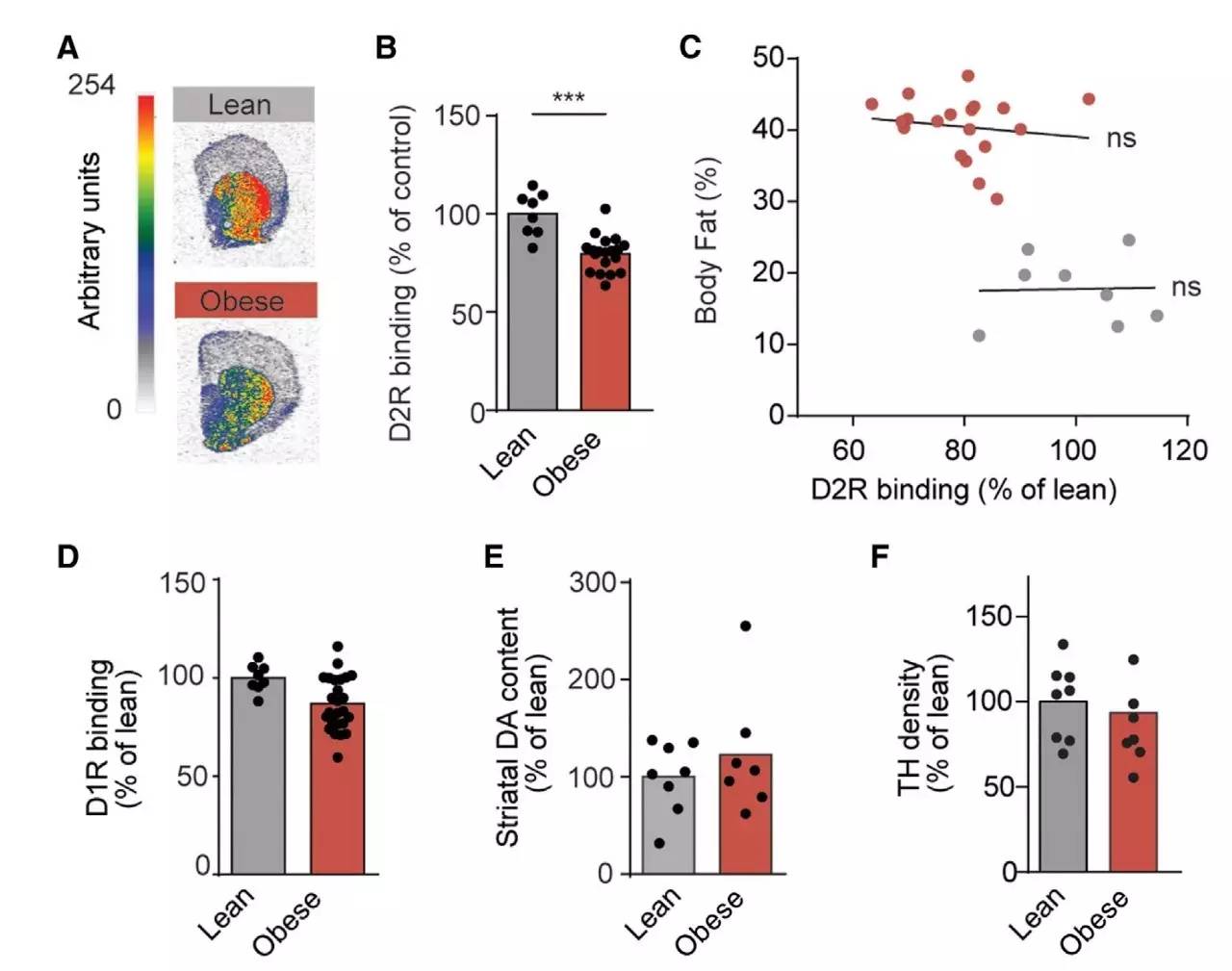 2. 肥胖会减少多巴胺受体D2R和多巴胺的结合
