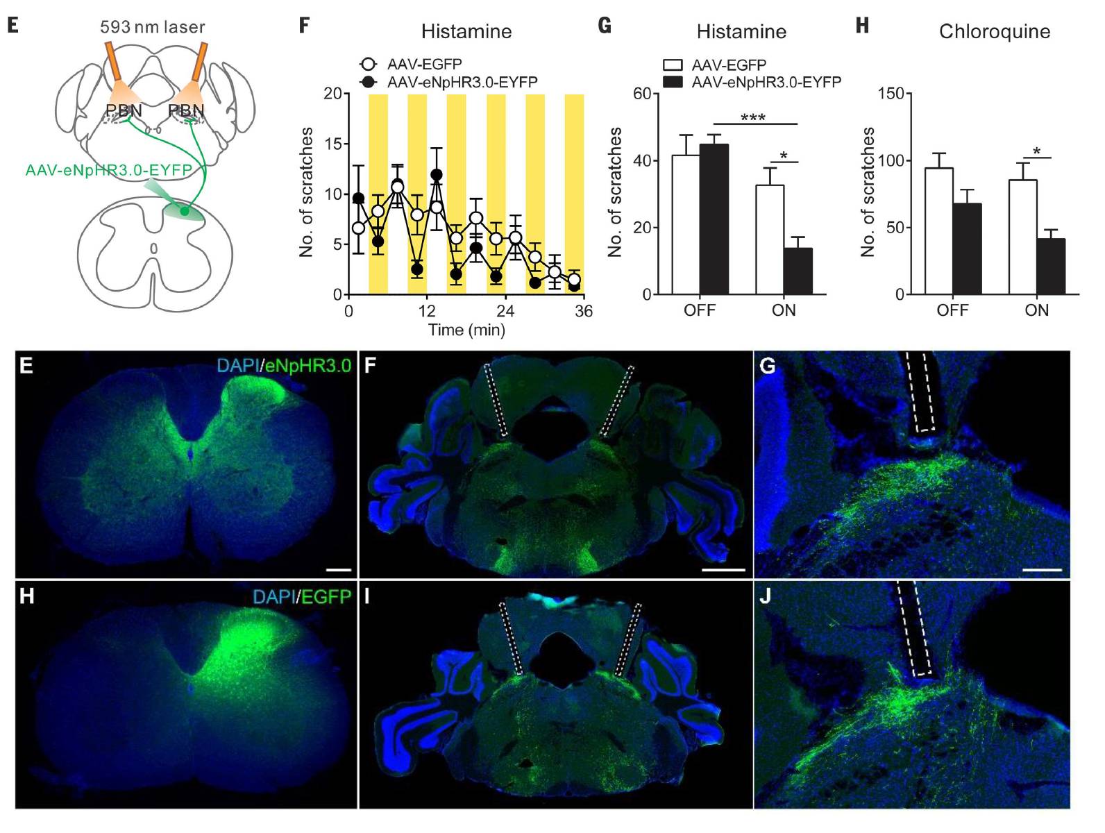 为了能让进一个步骤检验员脊髓-臂旁核的投影在痒促发的搔痒情况中具有怎样才能用途,小编应用光基因遗传规律学的方法参与研发。指明方向AAV病原体各种载体,小编在脊髓感觉神经元形容eNpHR3.0这一种仰制性的光敏感度检修通道(图2),并确认在臂旁核广告植入金属,仰制脊髓-臂旁核的投影,察觉到仰制该通道会严重减小组胺或氯喹致使的小鼠搔痒情况(图2),时小鼠的运转没得收到了的影响。