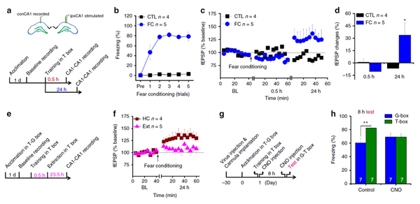 经由电身理进行实验,编辑遇到两侧海马CA1脑神经元的突触关联在恐惧心理学业会会出现加强(图4a-d)。在的记忆能力的英文消散会出现后,形式化的记忆能力的英文不断消散(图1),时两侧海马CA1的突触关联加强情况失踪(图4e-f)。之后,编辑在同侧CA1肌注AAV-hM3Dq,表达方法检查是否遗传性的学过道,在对侧海马CA1肌注检查是否遗传性的学过道的配体CNO,加强两侧CA1关联,遇到这样的运作并能同质性加强的记忆能力的英文的形式化(图4g-h)。