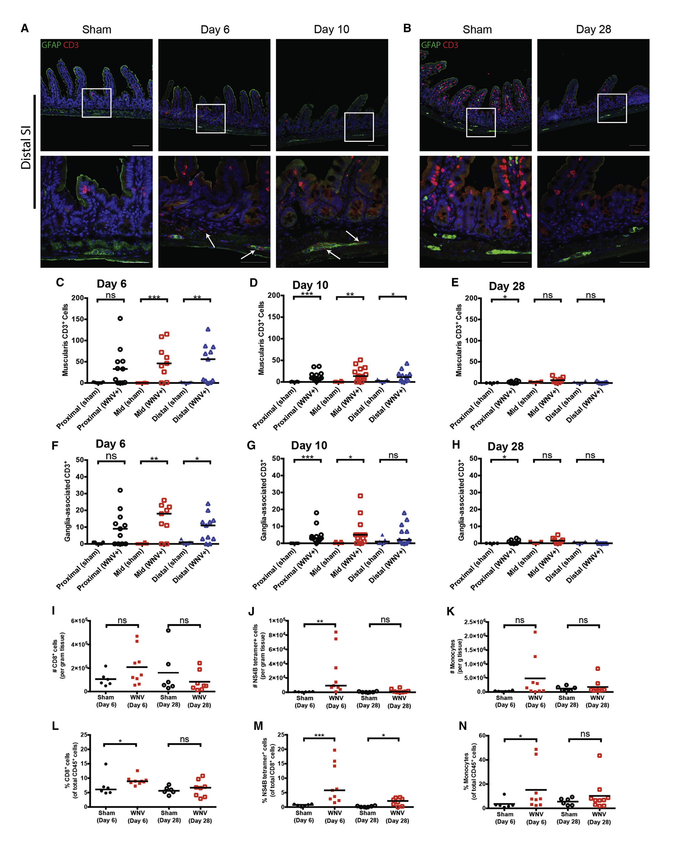 陆陆续续,小说作家对中性化粒生殖中枢神经中枢神经上皮神经组织侵润这种现象实现论述,结论显示信息,直肠的肌层和肠肌层中枢中枢神经节诞生CD3 T生殖中枢神经中枢神经上皮神经组织侵润(图4A),在6dpi时,一个消化道道的道中肌层CD3 T生殖中枢神经中枢神经上皮神经组织(图4C)、中枢中枢神经节各种相关CD3 T生殖中枢神经中枢神经上皮神经组织数据(图4F)正相关多,10dpi和28dpi,开启减低(图4B,D-E,G-H),这一项结论与据此WNV RNA平行大幅度降低统一(图2)。论述还发展受WNV病毒的消化道道的道分析免疫力生殖中枢神经中枢神经上皮神经组织侵润,进来涉及到抗原特喜欢的人CD8 T生殖中枢神经中枢神经上皮神经组织的流向(图4I-N)。