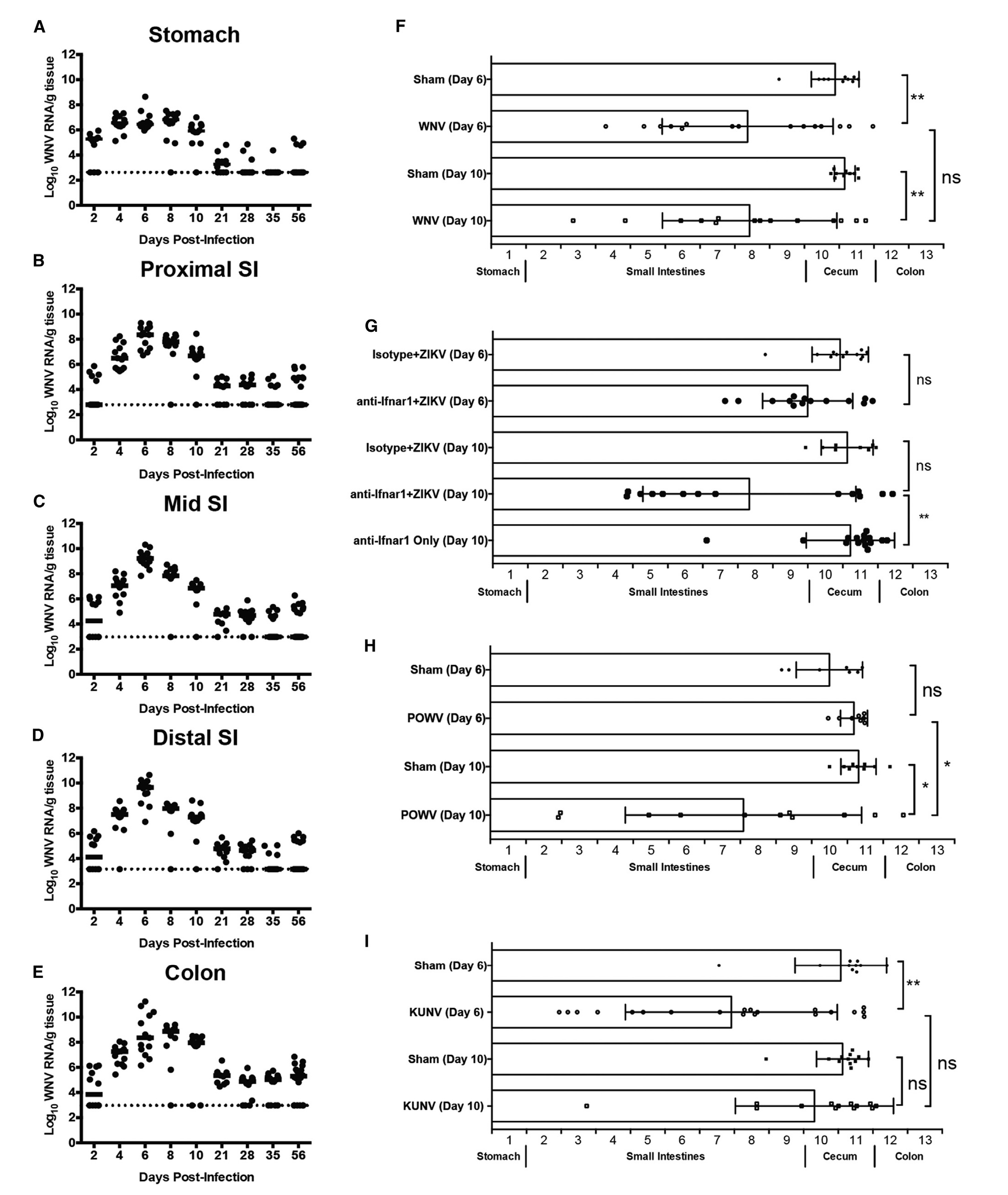 研究探讨还会感觉在6dpi和10dpi时沾染WNV小鼠的直肠胃消化消化特殊性减轻(图2F);在沾染ZIKV(图2G)和POWV(Powassan virus 波瓦桑病原体,与WNV有亲缘密切关系,图2H)小鼠中也会感觉有些相似的結果,但物理问题比如沾染WNV小鼠的非常明显。进一部,诗人用CHIKV(Chikungunya virus, 基孔肯雅病原体,没有能蔓延到面神经末梢面神经体统)做对照,会感觉在直肠胃组建中CHIKV层次很低。受CHIKV沾染的小鼠未展示出节段性肠扭转物理问题(图1A,1D)。这表面,体统性RNA病原体沾染并不会致使直肠胃消化消化障碍性。