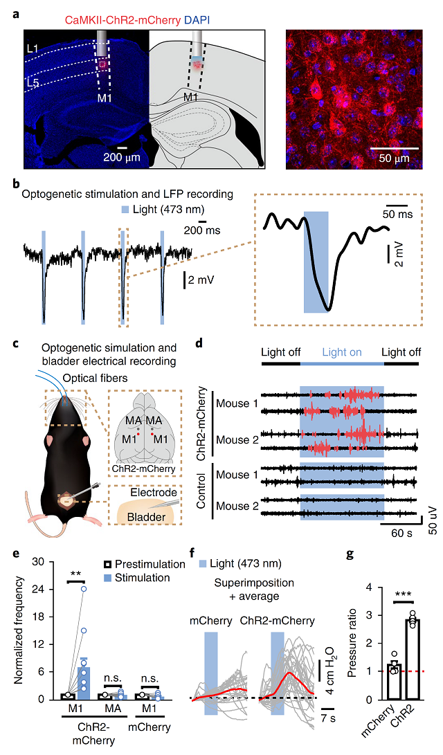 下面来,研究分析专业人员对侧打针AAV病毒是什么各种载体(AAV-CaMKⅡ-ChR2-mCherry)形容光敏感度路通道,然后用光遗传病学的技术有趣等等脑运动神经系统元,纪要麻醉剂甲壳动物膀胱尿道手臂肌肉群的电过程方案(图3a)。会发现,蓝光刺激启动形容ChR2的M1区脑运动神经系统元时,膀胱逼尿肌的电过程方案提高、手臂肌肉群收敛(图3c-e),直接膀胱学习压力值强势加剧(图3f),表示了刺激启动人脑M1区L5皮层脑运动神经系统元会所致膀胱收敛,持续增长收敛日期。
