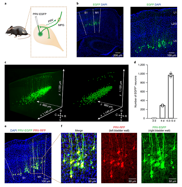 合理利用伪狂犬病毒是什么的逆向工程工程示踪,小说作家应当标出了成熟雄性小鼠膀胱壁与简单足球运动皮层和简单察觉皮层的逆向工程工程跨突触的链接(图1),且这么多映射大多于皮层M1和S1区的第四层(图1b-f)。