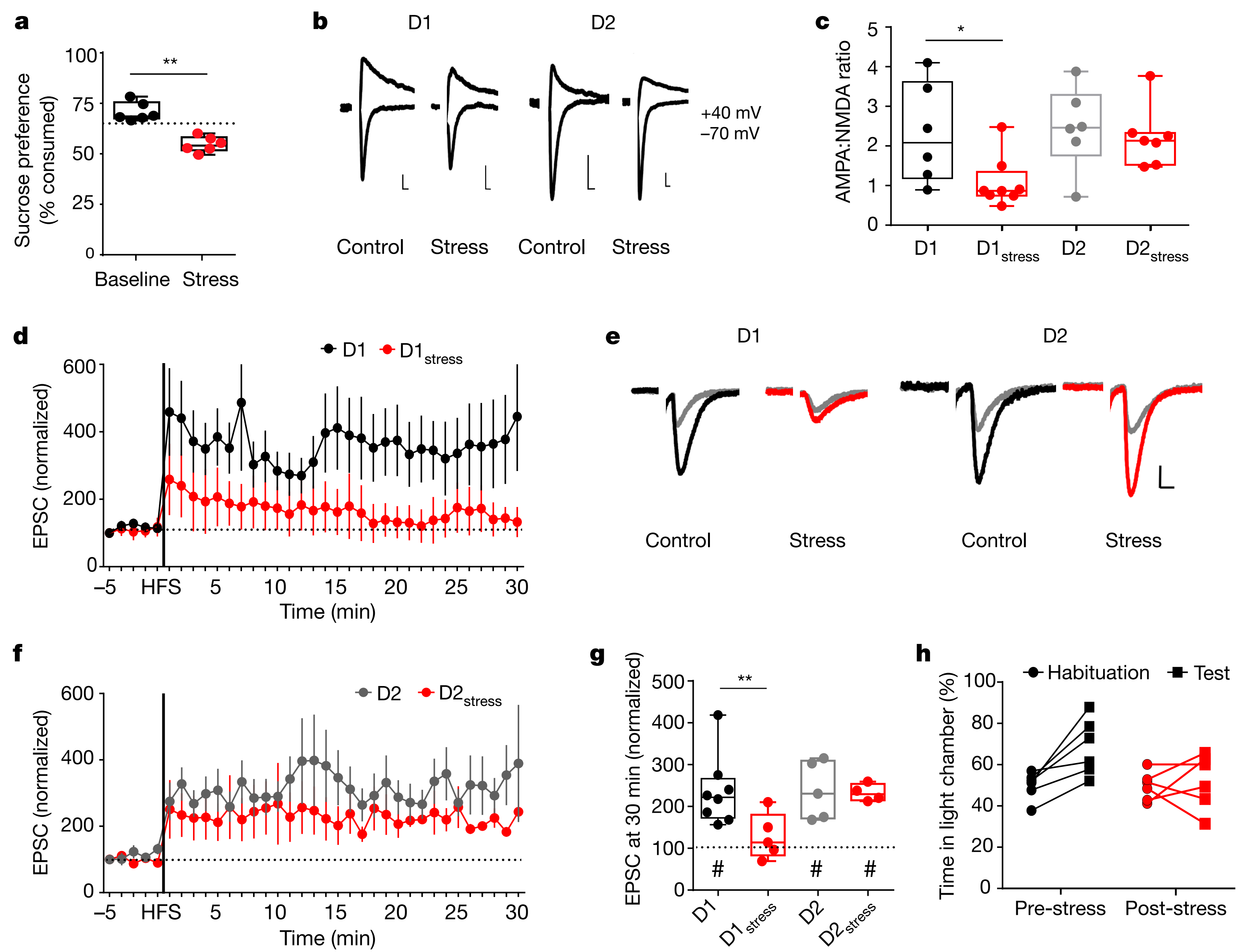 上前的钻研表面,漫性的负荷会引致焦虑抑郁,在其中想象其一是“负罪感缺少”[3],今天以糖水喜欢范式是 方式学表现(图3a)。膜片钳电生物学钻研出现,漫性的负荷治疗的小鼠,D1R-MSN的AMPA:NMDA力度相对分子质量下滑,标准着突触承载力的下滑。不仅而且,中频率热血已经促使D1R-MSN制造LTP。而D2R-MSN无每会影响,既可促使LTP,其AMPA:NMDA力度相对分子质量是不变(图3b-g)。在体实验报告地方,漫性的负荷治疗的小鼠,中频率热血海马-伏隔核环路已经促使条件位置上喜欢想象(图3h)。