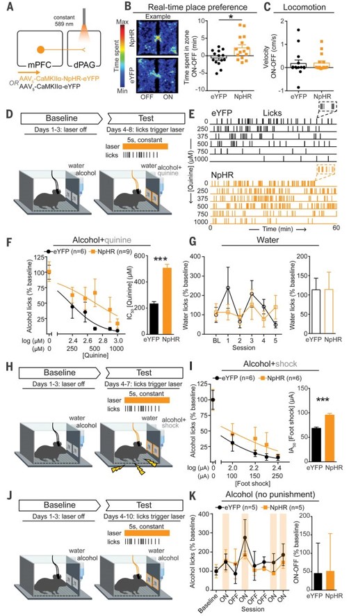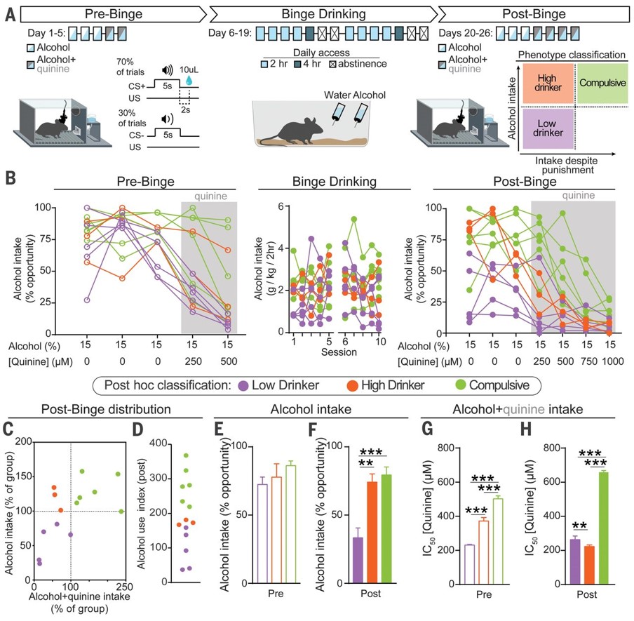 调查显示,多数人接触过酒精,但其中只有小部分人会发生强迫性酗酒现象。对于强迫性酗酒发生的诱因,我们知之甚少。本篇文章结合实验范式设计、钙成像、光遗传学等方法,发现mPFC-dPAG环路与酒精强迫性密切相关。在小鼠初次饮酒时,其mPFC-dPAG神经元的活性可表征小鼠对酒精的易感性。此外,抑制mPFC-dPAG环路诱发小鼠发生强迫性酗酒行为,而激活mPFC-dPAG神经元显著减少小鼠饮酒行为。这项研究阐释了调控强迫性酗酒发生的脑区及其神经环路机制,为酒精易感性的个体差异提供了一种可能的科学解释,也为临床治疗强迫性酗酒相关疾病提供理论基础。