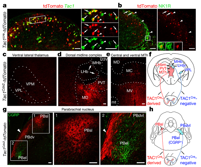 过去的研究证实,脊髓速激肽1型(TAC1)神经元参与痛觉行为[2],于是作者对此类神经元展开详细研究。他们将TAC1-Cre小鼠与tdTomato报告鼠杂交,发现TAC1-tdTomato 神经元与NK1R大量共标(图1a-b),而NK1R是脊髓第1层上行投射神经元的分子标志。