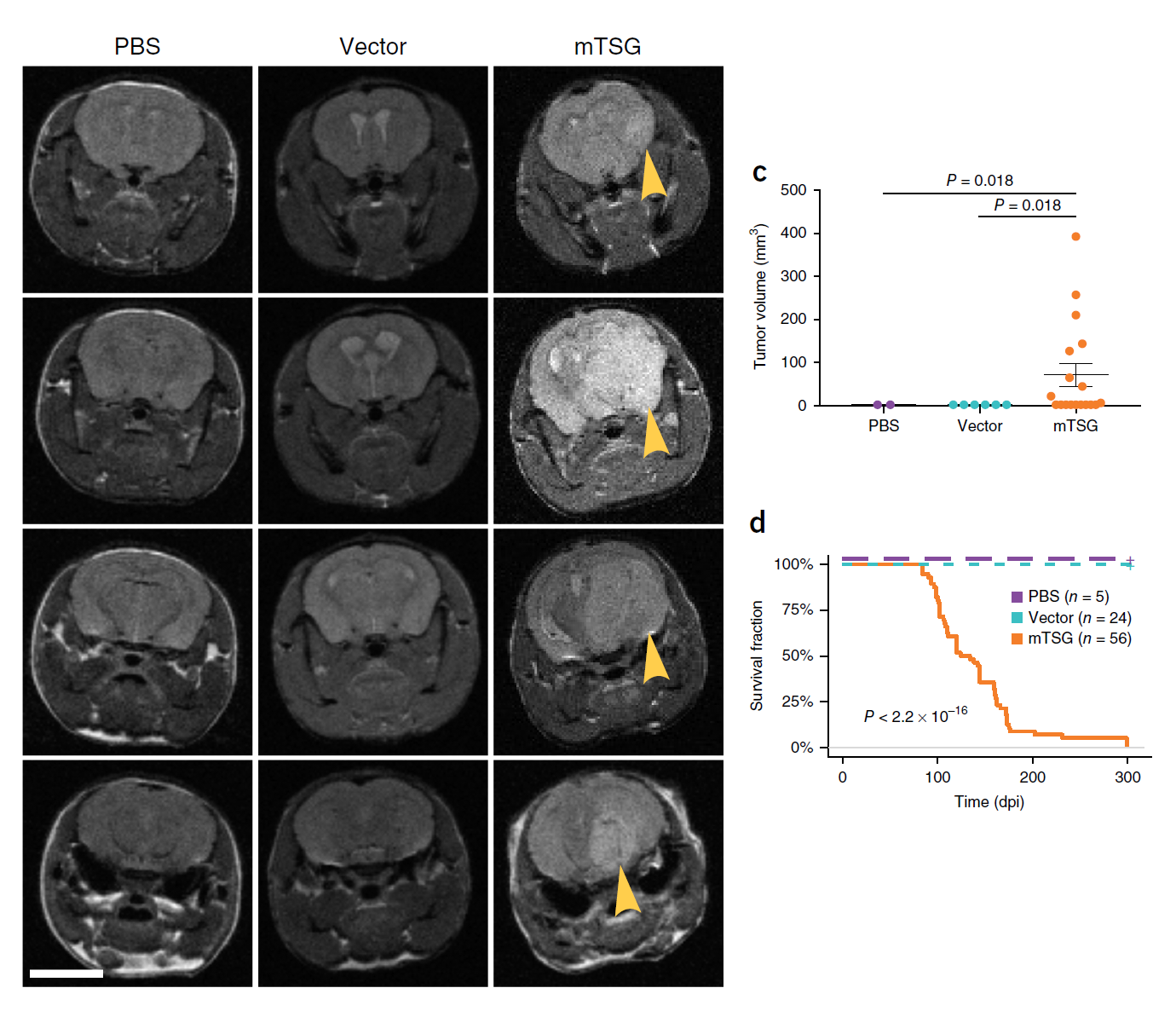 2. AAV-mTSG注射的小鼠脑肿瘤展现了胶质母细胞瘤的特点