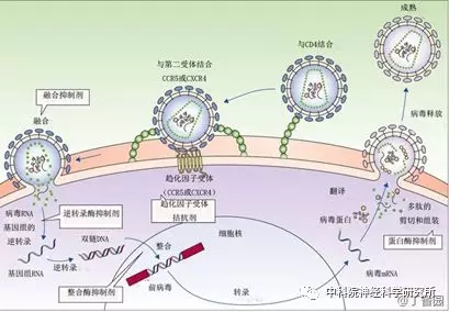 图注:艾滋病毒感染细胞时需要受体CD4以及辅助受体CCR5或者CXCR4,出胞时利用细胞膜成分作为包膜覆盖在成熟病毒粒子的最外层。