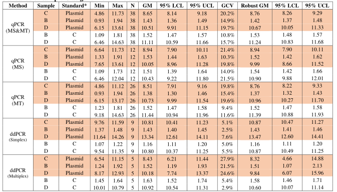 每种方法由不同的操作员分别于3天进行3次独立的实验,收集各实验室样品的原始数据和定量结果(例如qPCR Ct值或ddPCR液滴计数)进行分析。