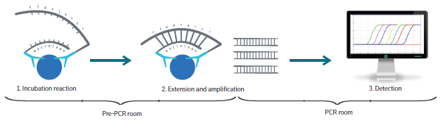 :使用Universal PCR Probe探针与所有扩增的DNA序列相匹配,PCR反应产生荧光信号,标记的核酸序列数量与待检测蛋白质的数量成正比。