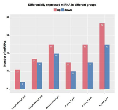 差异基因上下调频数统计用于判断不同实验条件下差异表达miRNA的个数。其中横坐标表示比较组信息,纵坐标表示上下调miRNA的数目,红色代表上调miRNA,蓝色代表下调miRNA,其中数字代表上下调miRNA的数目。