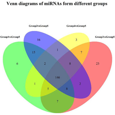 通过不同比较组之间差异基因韦恩图可以直观地显示出不同比较组之间共同的和特有的差异表达miRNA的个数,差异基因韦恩图具有明显的生物学意义,比如是相同对照不同处理的实验设计情况,可以将不同处理下的差异基因进行比较。