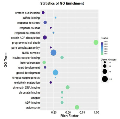 对差异miRNA进行GO富集分析并以散点图展示,Rich factor表示位于该GO的差异基因个数/位于该GO的总基因数,P值越小,GO富集程度越高。